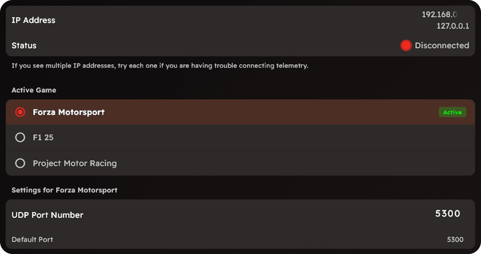 In the same 'UDP Race Telemetry' menu, locate 'Data Out IP Address'.